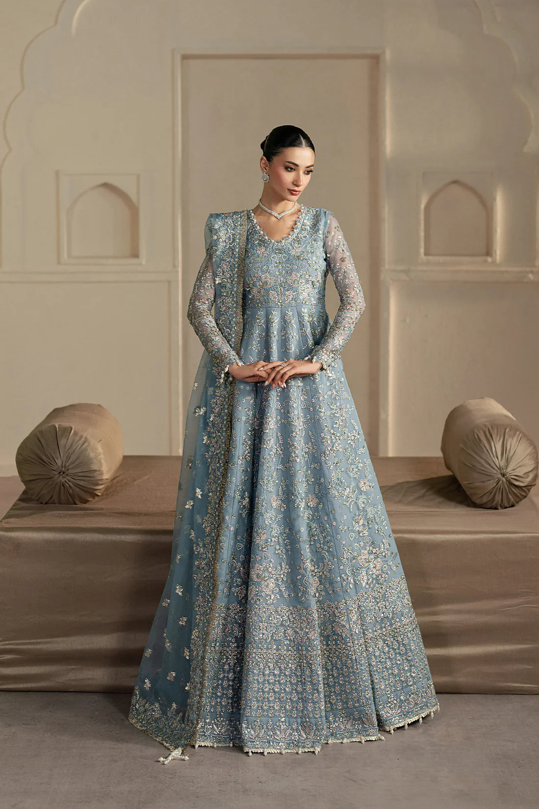 | Nikkah, Baraat, Walima | Hand-embellished silk gowns | Intricate zardozi borders, detachable trains, custom length tailoring at checkout |