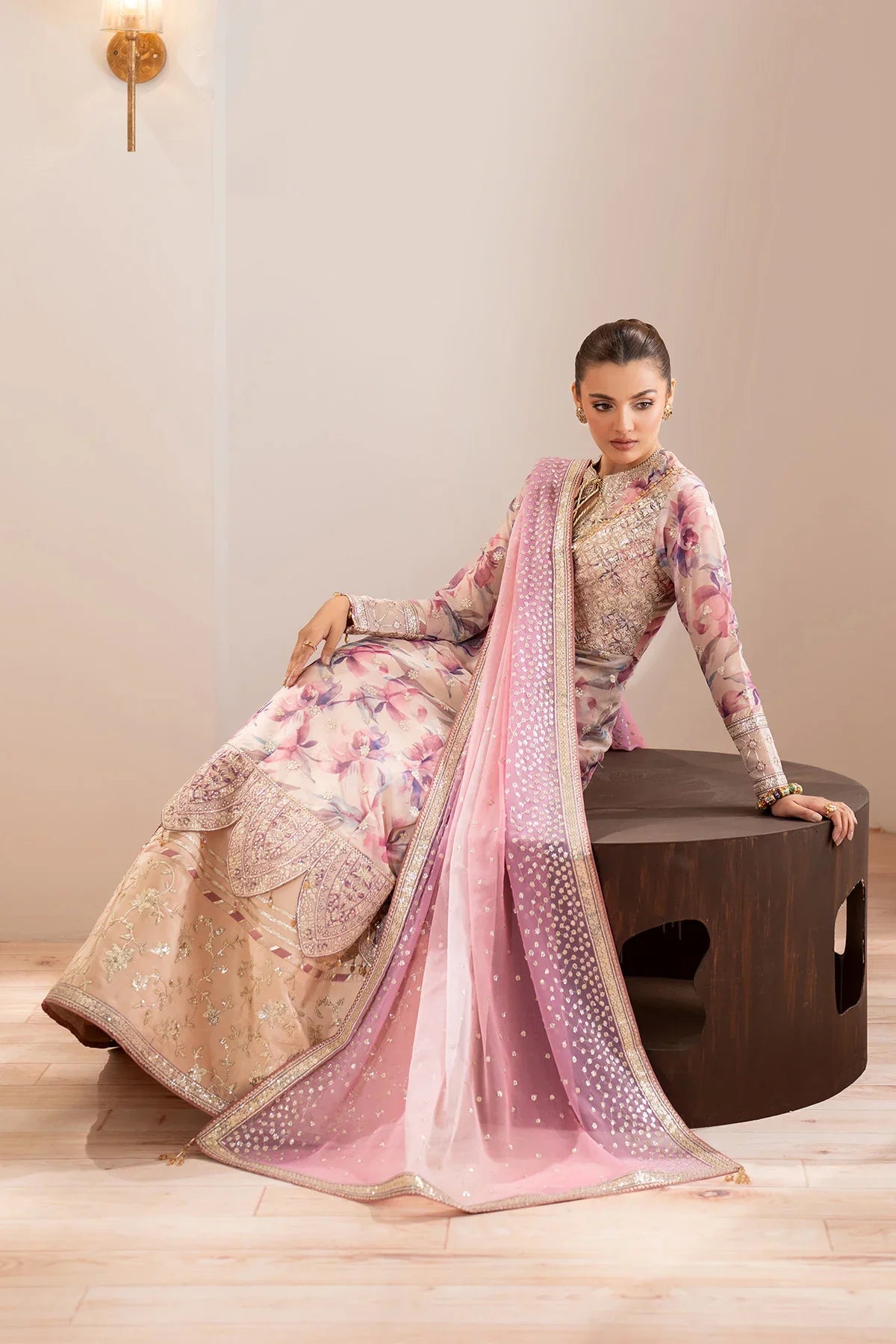 A powder pink embroidered chiffon ensemble featuring a floral-themed maxi, brought to life with intricate copper-gold embroidery and subtle sequin shimmer that adds delicate charm. Paired with Russian-dyed trousers and a printed chiffon dupatta, this look is perfect for festive occasions — blending refined sophistication with nature-inspired elegance.
