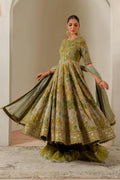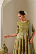 This elegant outfit features a printed parrot green chiffon maxi adorned with minimal embroidery on the neckline. Completing the look is a embroidered printed chiffon dupatta and dyed silk trousers, adding a touch of finesse. Ideal for modern celebrations.
