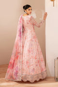 A dreamy rose-pink maxi, embellished with intricate silver threadwork and delicate embroidery, cascades effortlessly over a flowing silhouette. Paired with a printed chiffon dupatta adorned with finely detailed embroidered borders, this enchanting ensemble evokes a garden fairytale.