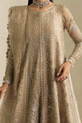 Radiating timeless charm, this champagne-toned organza ensemble is richly adorned with intricate silver embellishments and delicate threadwork that cascade gracefully across the flowing silhouette. The full-length design with sheer embroidered sleeves brings an air of refined sophistication, while the scalloped borders add depth and detail. Paired with a matching organza dupatta, this look embodies understated luxury — perfect for weddings and evening soirées where elegance speaks louder than words.