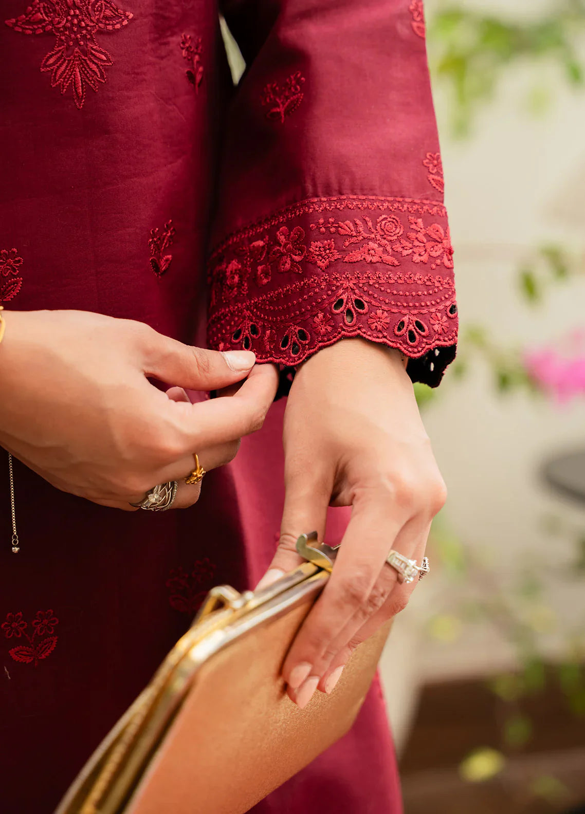 Zyra is a striking two-piece set in a bold red base, crafted from premium lawn. The shirt is beautifully embroidered, exuding timeless elegance, while the embroidered lawn borders on the front and sleeves add refined detail. Paired with a complementing cotton trouser, Zyra is a perfect balance of vibrance and sophistication, making it an essential addition to your wardrobe.