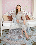 'Avenir', a modern silhouette ice blue tulle shirt intricately embellished with dabka, nakshi, crystals, baithki, badla, pearls and numerous other materials, embracing the perfect pastel montone pallete. The shirt is paired with impeccable embroidered and sequinned composition on raw silk fitted pants along with a gorgeous embroidered dupatta adorned with heavy pearl tassel detailing on its pallu.