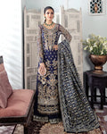 Qayinaat - is the most sought after design this wedding season. The midnight blue long A-line shirt is heavily handworked and is paired with a heavy embroidered jaal dupatta and a flaired sharara trouser finished pff with a beautiful embroidered border.