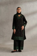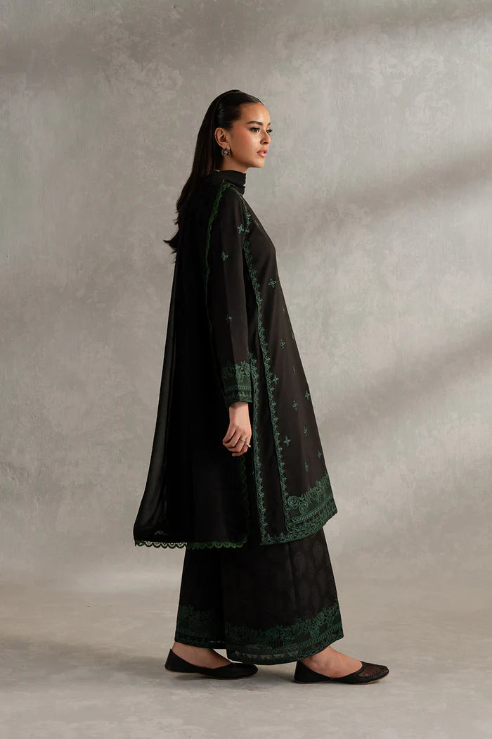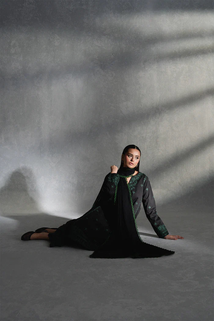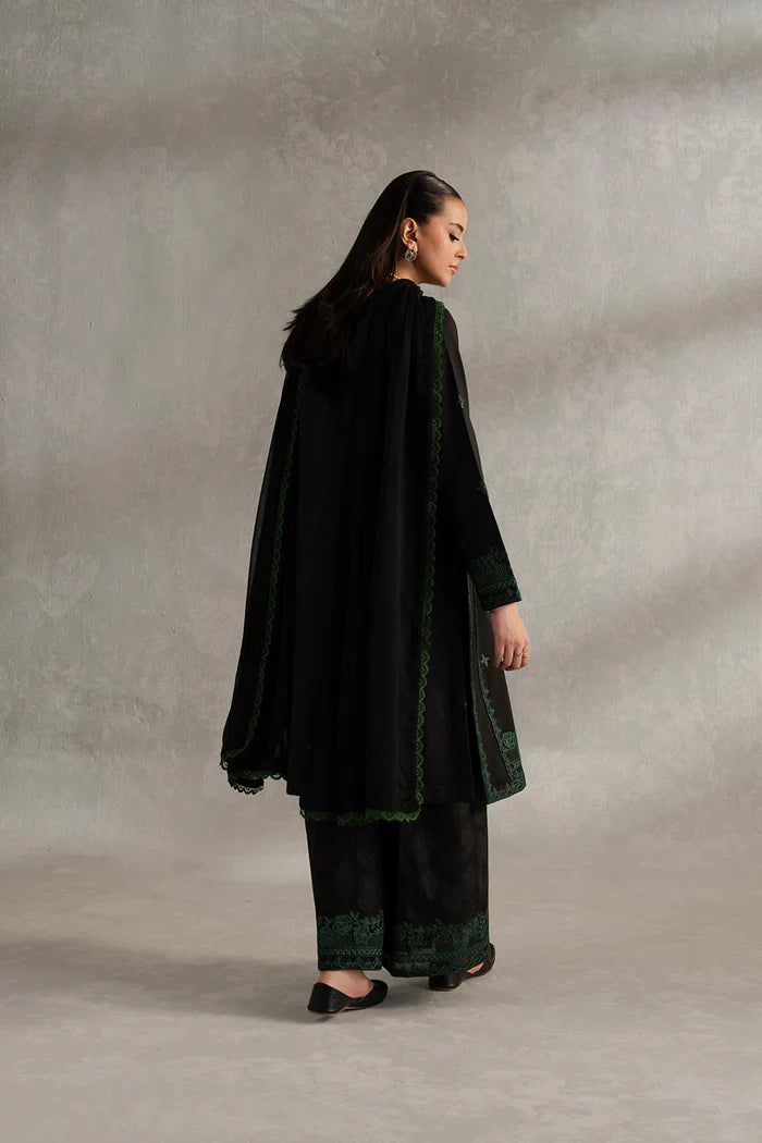 Turn heads in this effortlessly chic Black 3-piece pret ensemble, designed for the modern woman with an eye for detail. The embroidered lawn kurta features a graceful round V-neckline and pleated side panels that add depth and dimension to the silhouette. Paired with flared cambric cotton trousers adorned in a striking screen print and finished with intricate embroidery at the hem for added flair. The look is completed with a plain chiffon dupatta, delicately trimmed with lace for a soft, feminine finish. A perfect fusion of bold prints and classic embroidery, ideal for day-to-evening elegance.