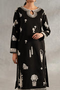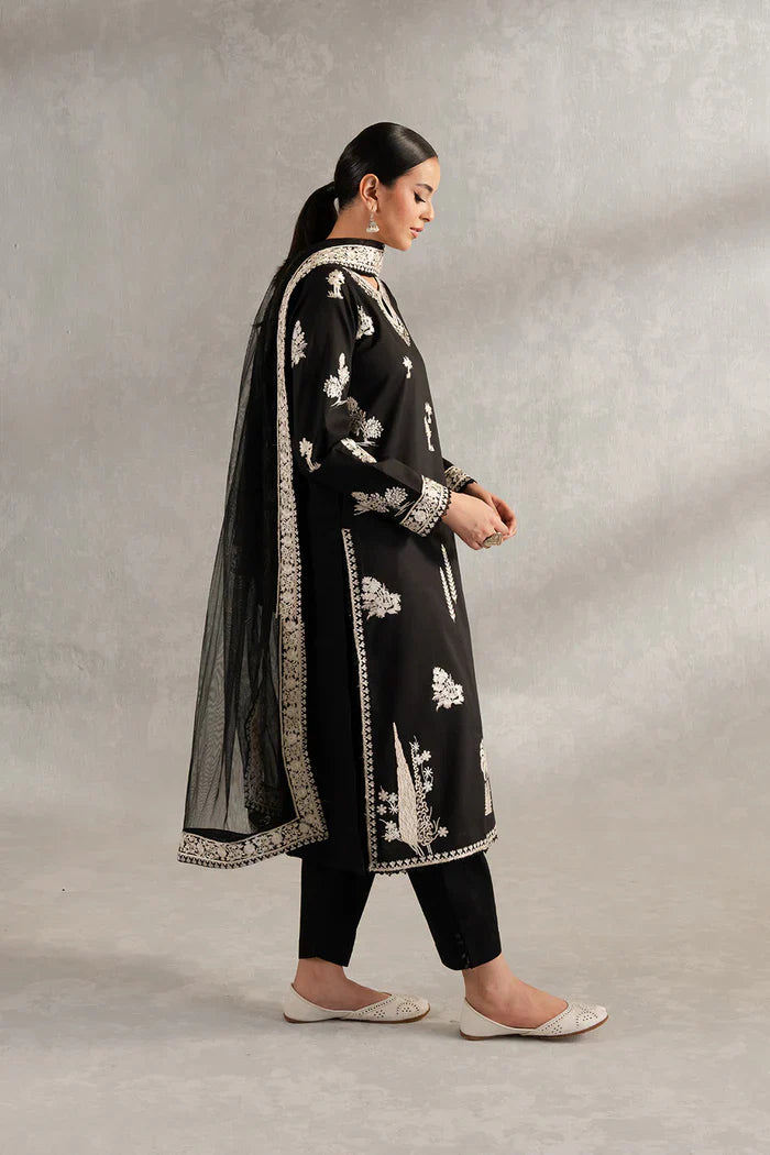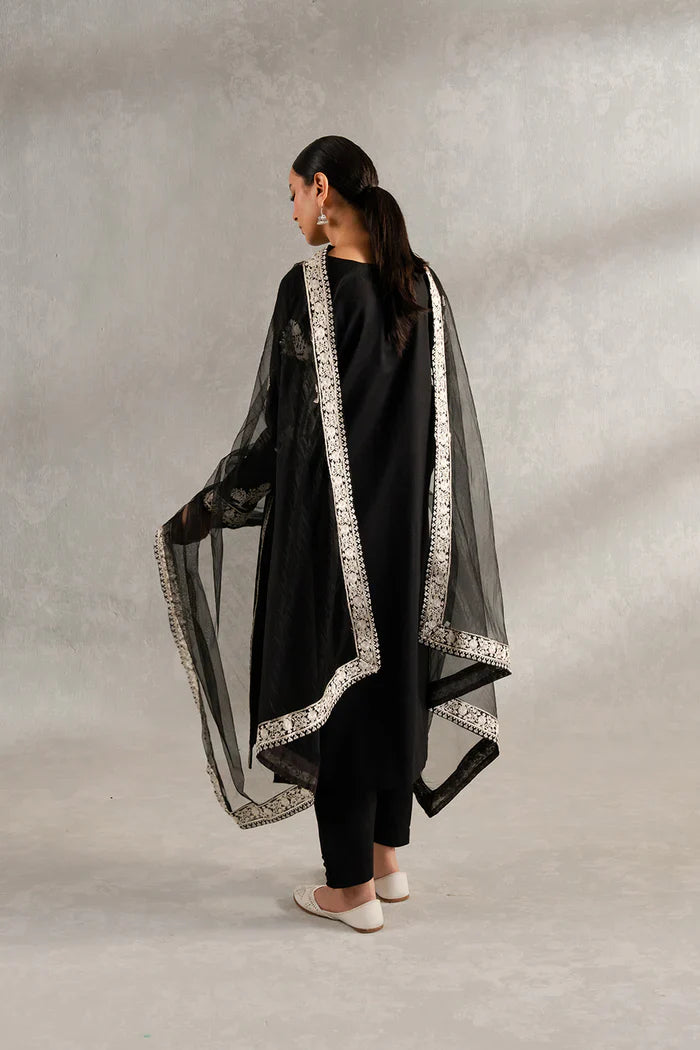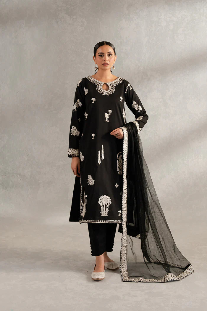 Elevate your wardrobe with this chic Black 3-piece pret ensemble, where classic elegance meets modern flair. The embroidered lawn kurta features a stylish keyhole neckline and delicately crafted embroidery on the sleeves, enhanced with refined lace detailing. Paired with tailored cambric cotton capri pants, adorned with charming side button accents that add a contemporary twist. The outfit is beautifully balanced with a net dupatta, finished with four-sided embroidered borders for a graceful, airy touch. Perfect for effortless day-to-evening transitions with a statement of sophistication.