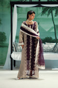 Step into timeless elegance with this breathtaking 3-piece Silver Pret ensemble, crafted from Organza and Tissue for the shirt, Grip for the trousers, and a delicate Bareeze Net Dupatta. The straight-cut, full-length shirt with side slits exudes grace, featuring a deep V neckline outlined with exquisite zari and sequin handwork in radiant golden and silver tones. Its center panel showcases sheer sophistication with plain net and heavy embroidered floral vines, bordered by intricate applique embroidery. The side panels captivate with geometric lattice embroidery in shimmering gold thread and sequins, perfectly balanced with a richly embroidered hem border. Sleeves are fully adorned with floral bunches and elegant motif placements at the cuff for added finesse. Paired with a classic straight trouser, this look is completed with a luxuriously detailed Bareeze Net dupatta, finished on all four sides with floral zari and sequins embroidery and jamawar borders. A sleeveless straight slip enhances versatility and ensures a refined layered finish. A statement piece for the modern woman who adores heritage and high fashion combined.