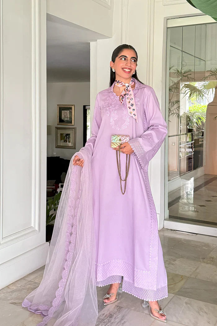 Indulge in graceful sophistication with this Lavender Lilly 3-piece pret, crafted in soft lawn and paired with cambric cotton trousers and a delicate net dupatta. The embroidered collar with a scalloped V-neckline adds timeless charm, while the long shirt is beautifully enhanced with intricate embroidery on the hem and side seams. Fitted sleeves with lace detailing bring a touch of refined elegance. The flared trouser features an embroidered hem, creating a perfect balance of style and comfort. Completing the look is a net dupatta adorned with four-sided embroidered scalloped borders, exuding luxury with every detail. A stunning choice for both festive gatherings and daytime charm.