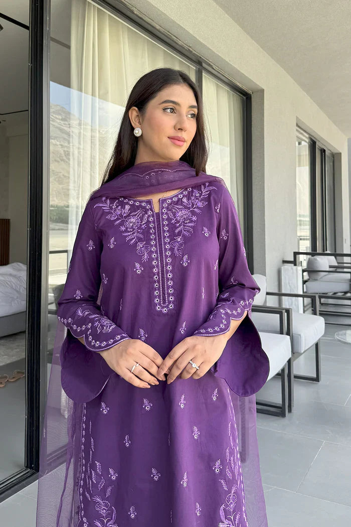 Exuding timeless elegance, this Plum Violet 3-piece pret is a masterpiece in refined craftsmanship. The straight-cut lawn shirt features a rounded hemline with scalloped finishing, paired with a round neckline and slit, adorned with delicate embroidered motifs along the placket. The full-length shirt is enhanced with scalloped edges and graceful floral embroidery, while all-over tonal sprays add subtle charm. Its straight cambric cotton trousers are styled with embroidered scalloped borders at the ankle hem for a chic finish. The look is completed with a net dupatta, beautifully framed with four-sided embroidered scalloped borders, creating a statement of effortless sophistication.