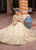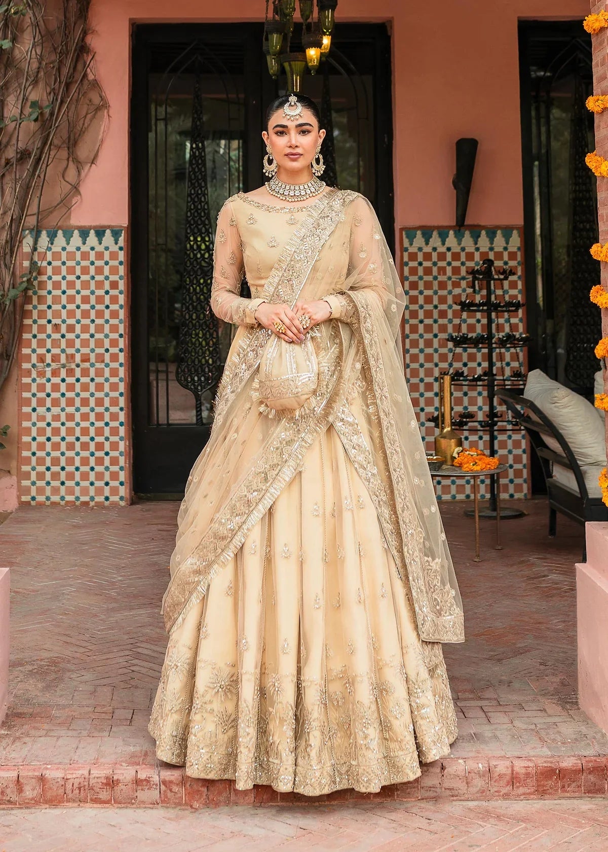 The beauty, Zarafshan is the center of this festive season. An ivory hue fit for royalty with a magical floral booti spray on the choli and sleeves enhanced with dubka and naqshi handwork. The 12 net panels have the continuing spray with a tribal floral border detailed with pearl, cutdana and crystal embellishments. The soft bareeze net dupatta has a four side tilla and resham embroidered border with micro sequin detailing that perfectly compliments this strikingly regal ensemble.