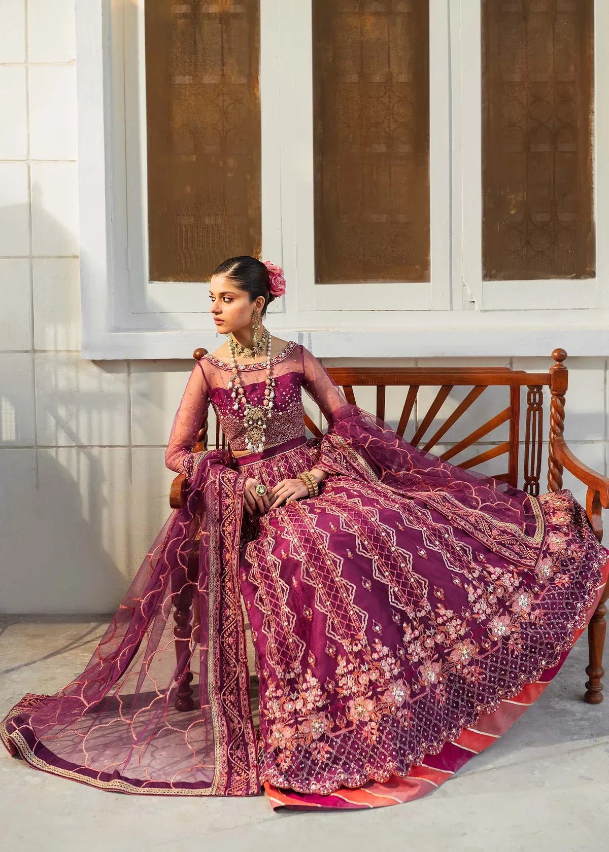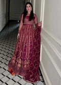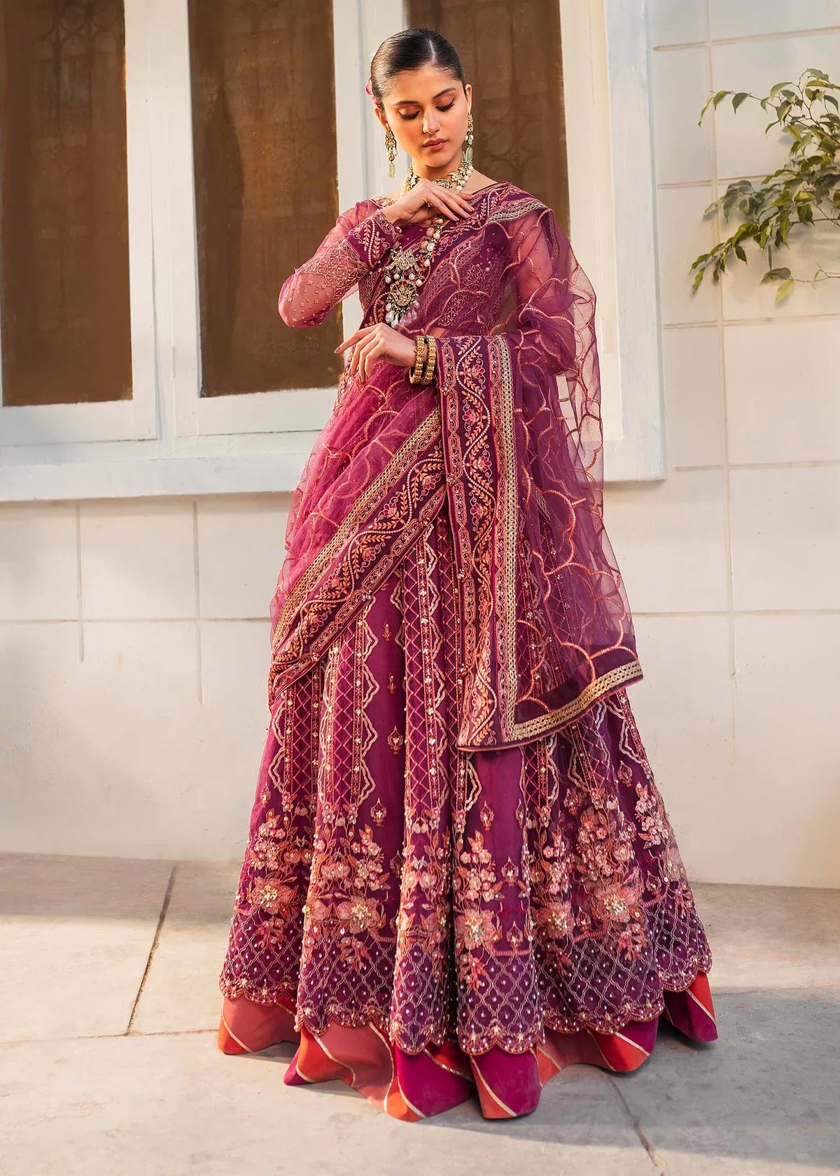 A portrait of glamour and effortless beauty, ‘Ankahi’ is poetry embedded in embroidery and embellished detailing. Soft bareeze net magenta is brought to life with ornate gold tilla embroideries contrasted with vivid fuchsia and fiery orange. Floral embroideries span across the border of the kallis while the bodice and dupatta compliment with Mughal style motifs. Crystal handwork along with micro sequins bring the ensemble to a whole new era