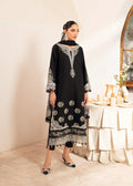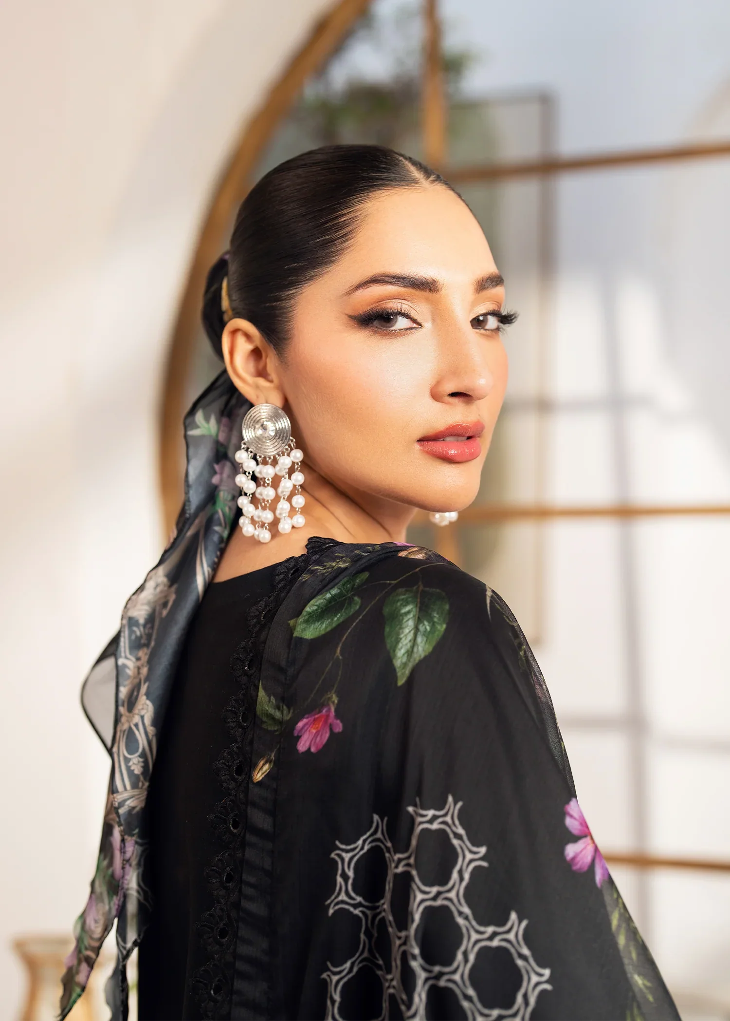 Bold and timeless, this black embroidered lawn outfit is a wardrobe essential that speaks volumes with its understated luxury. Crafted from premium lawn fabric, it combines breathable comfort with a classic deep tone featuring intricate embroidery in contrasting tones highlighting traditional floral and ornamental patterns across the shirt front, sleeves, and hem. The embroidery adds depth, texture, and a subtle shine, elevating the black base with timeless charm. The outfit is paired with Digital printed chiffon dupatta and plain dyed trousers.