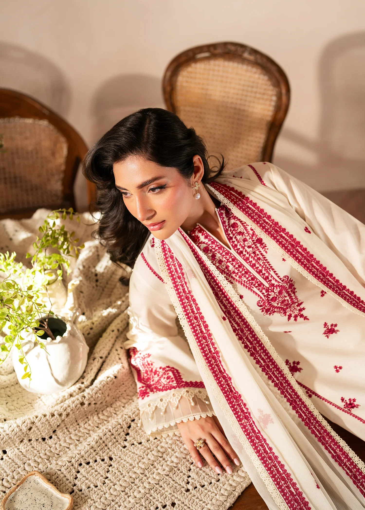 Delicate thread embroidery adorns the front, sleeves, and hemline, featuring intricate floral and vine motifs that reflect timeless craftsmanship. The embroidery is carefully coordinated in contrast threads. Paired with embroidered Chiffon Dupatta and plain trousers.
