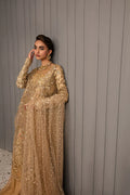 Golden tissue hand embellished shirt with organza embroidered crushed pants pair with net hand embellished dupatta finished with crystal tassels
