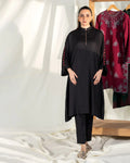 A chic and elegant winter outfit featuring a black tulle design that combines sophistication and warmth. The outfit includes a flowing black tulle overlay, creating a semi-sheer effect that adds depth and texture to the ensemble. The neckline is adorned with a stylish button detail, offering a polished and functional accent. Perfect for layering over fitted dresses or slim trousers, this versatile piece effortlessly blends modern fashion with timeless charm, making it an ideal choice for winters
